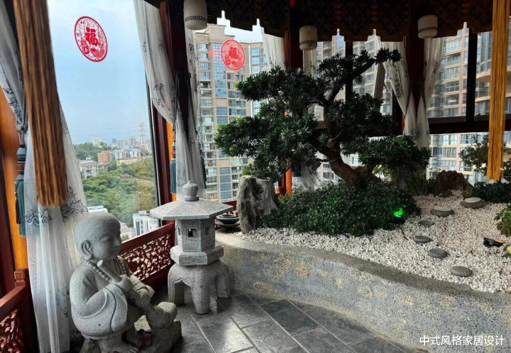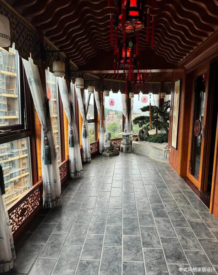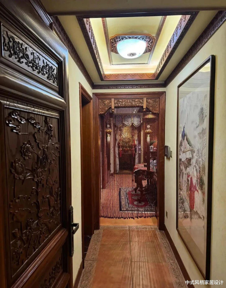 古典中式风格在平层中的成功,关键在于对“虚实关系”的精准把握。在需要开阔视野的区域,设计师大量留白,仅以少量红木构件点缀;而在重点区域,则不惜笔墨,打造精雕细琢的红木视觉盛宴。