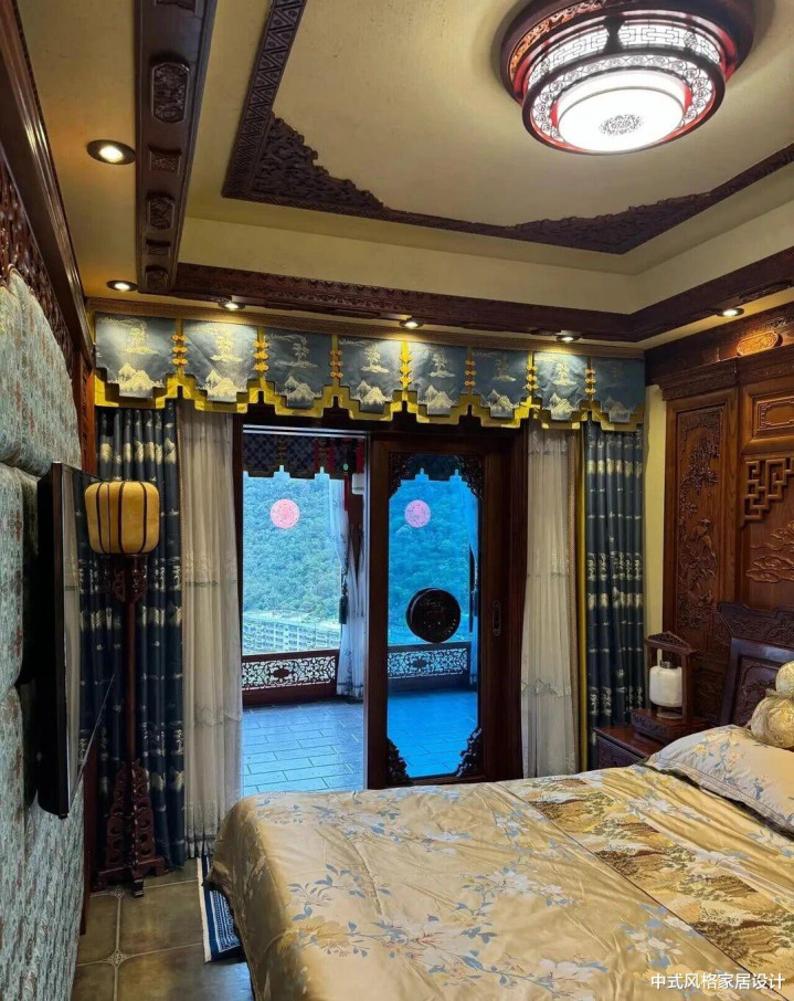 整体空间采用中轴对称布局,彰显中式建筑的核心精神。客厅中央,一套满雕云龙纹的红木沙发组稳居主场,背后墙面则以丝绸硬包装饰,绘有青绿山水。天花采用井字木梁结构,不仅丰富了空间层次,更暗合“井中有天”的哲学思考。