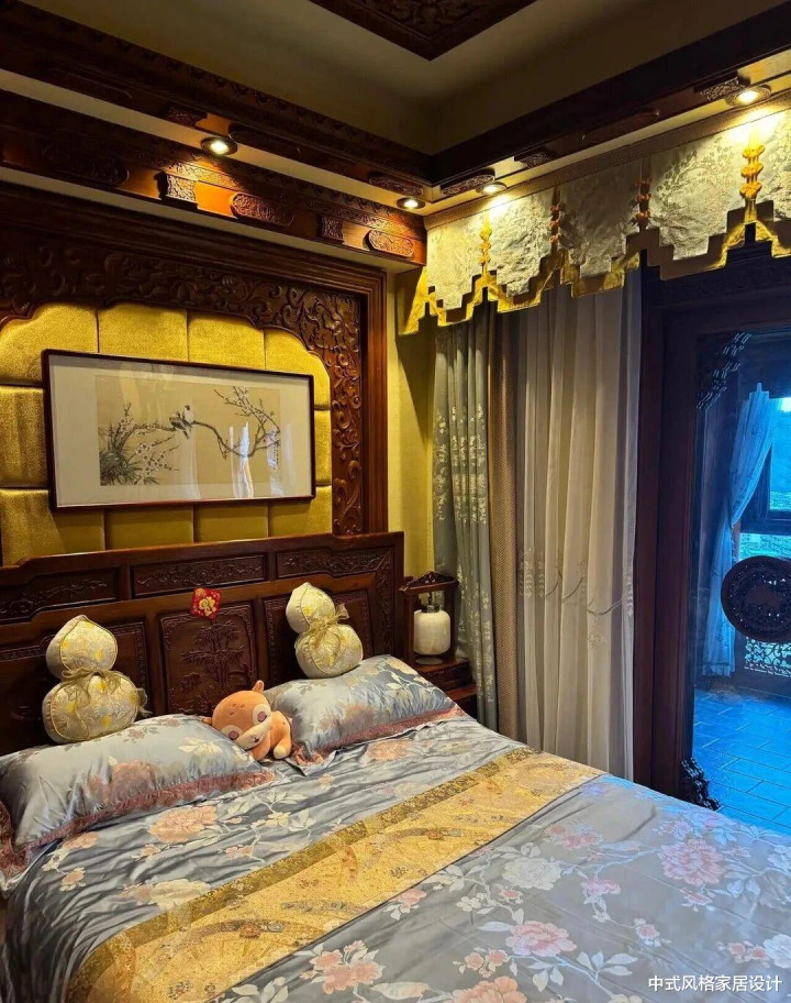 主卧室以红木雕花大床为中心,床头背景以红木镶嵌山水大理石,寓意“背有靠山”。整体色调沉稳典雅,营造出宁静致远的休息氛围。衣帽间的红木衣柜,门板雕刻着竹节纹样,象征虚心向上的品格。